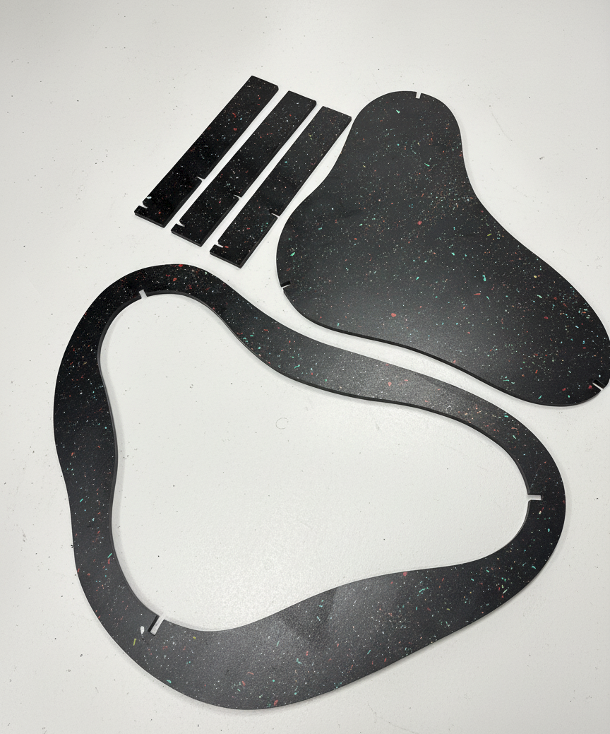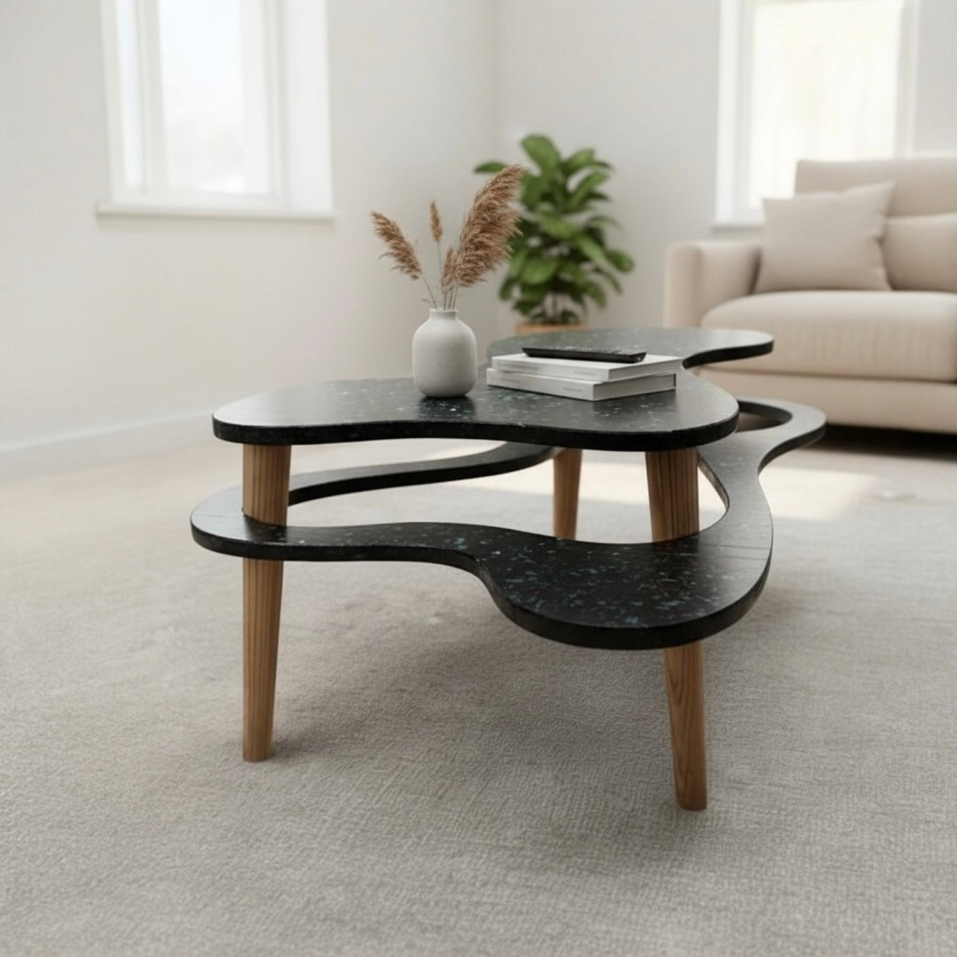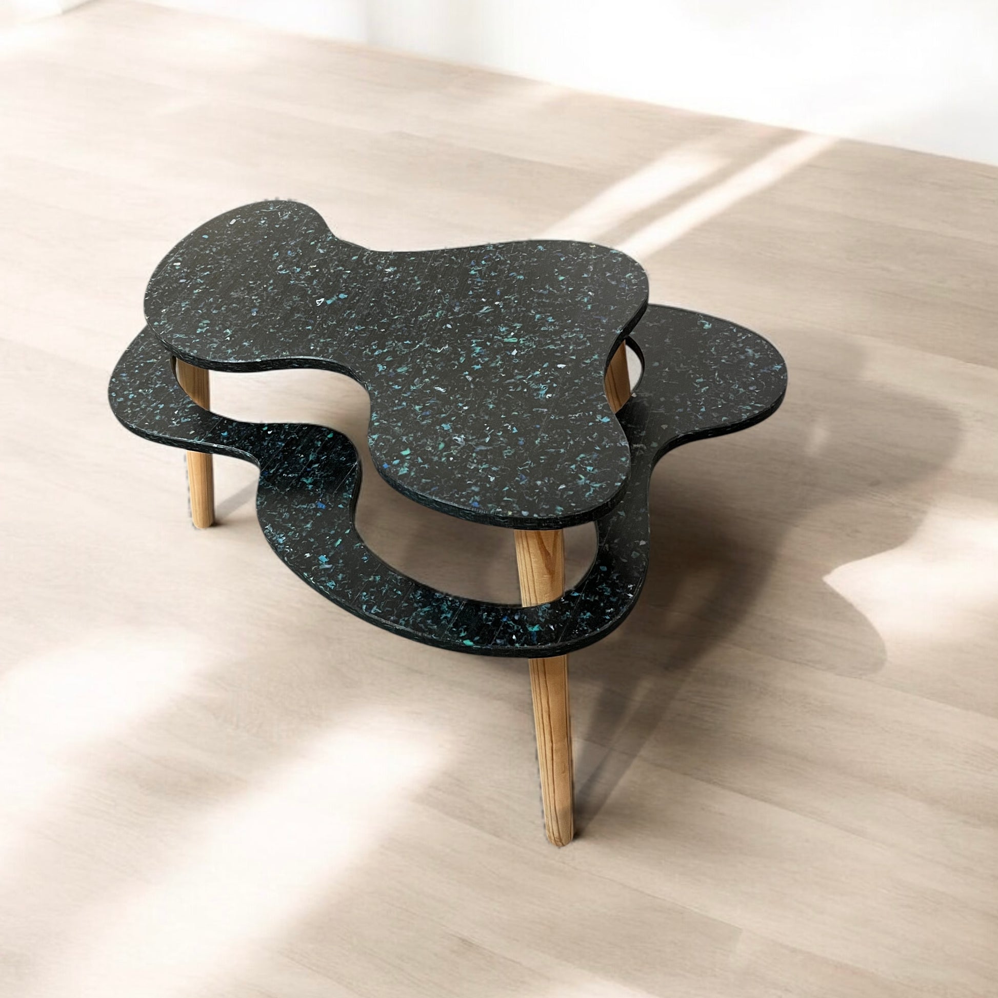 Entdecken Sie den eleganten Beistelltisch Y1, der nachhaltiges Design und moderne Ästhetik auf perfekte Weise vereint. Seine organisch geformte, zweistufige Tischplatte wurde mit größter Sorgfalt aus Recycling-Kunststoff (HDPE) gefertigt. Die dezenten, hellen, bunten Sprenkel machen jeden Tisch zu einem absoluten Unikat und einem individuellen Kunstwerk in Ihrem Zuhause.