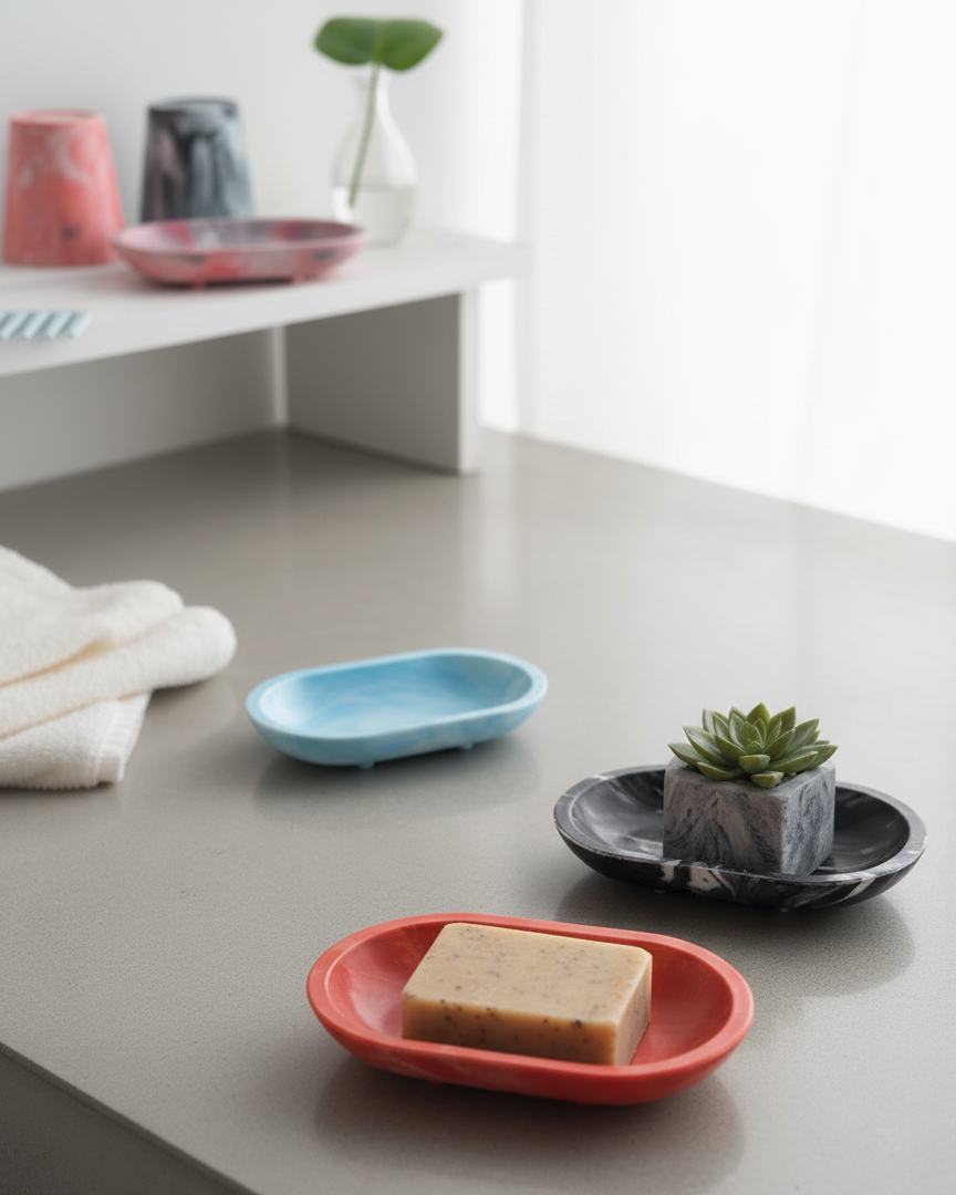 Unsere Seifenschalen sind nicht nur ein Statement für Umweltbewusstsein und Kreislaufwirtschaft, sondern auch äußerst robust, langlebig und pflegeleicht. Setzen Sie ein Zeichen für Nachhaltigkeit und Ästhetik - Tag für Tag.