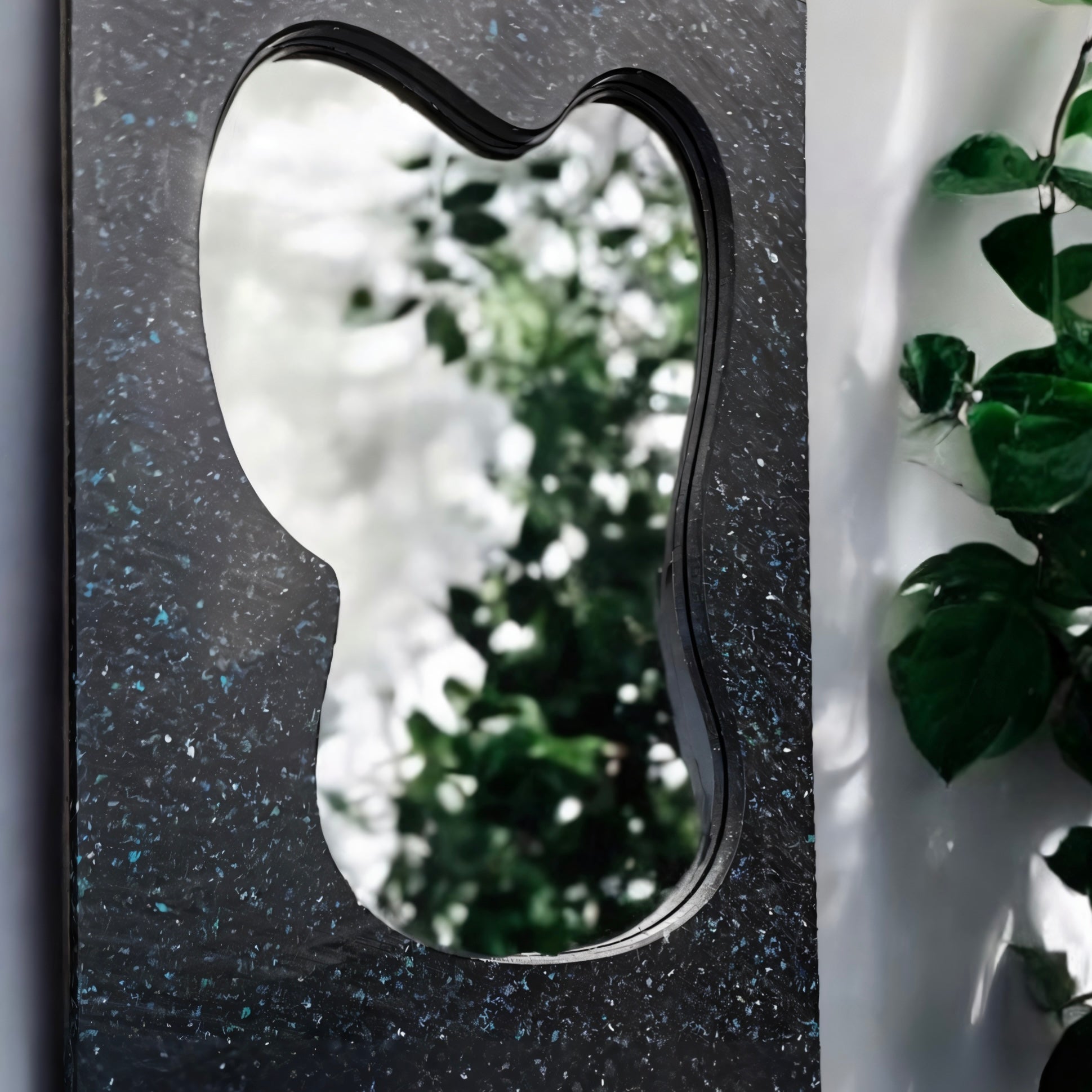 Der Rahmen? Ein Meisterwerk für sich. Handgefertigt aus 100% recyceltem PP-Kunststoff, erzählt seine tiefschwarze Oberfläche mit den funkelnden, bunten Sprenkeln eine Geschichte von Wiedergeburt und modernem Chic. Jeder einzelne Spiegel ist ein Unikat, ein winziges Universum aus Farbe und Form, das von den Händen unserer Kunsthandwerker geformt wurde.